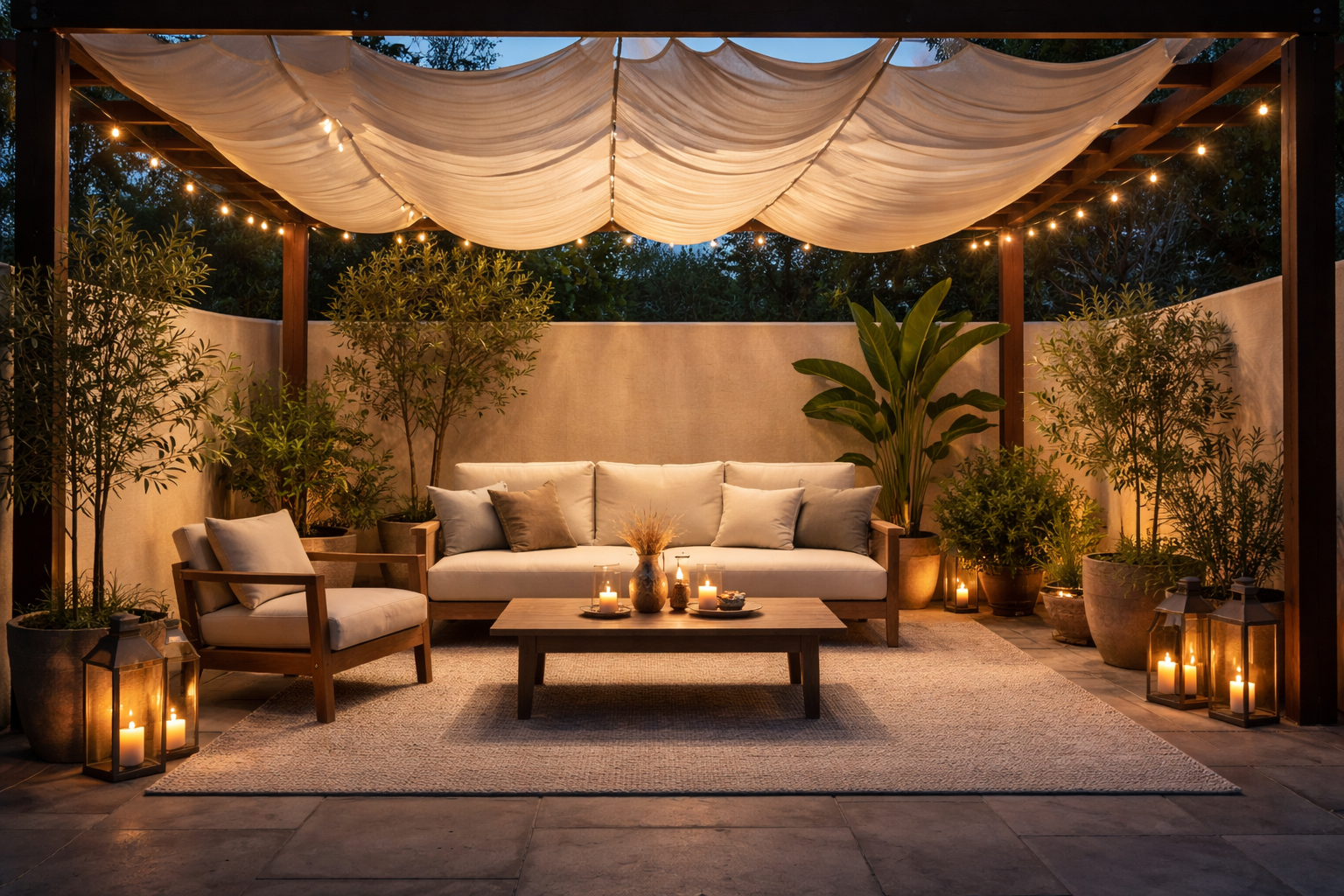 Houd het licht en simpel: één duidelijke pergola-plek, een rustige basis en groen als hoofdrol. Gebruik warm, subtiel licht en beperk accessoires. Zo blijft het ontspannen en tijdloos, ook in een kleinere tuin.