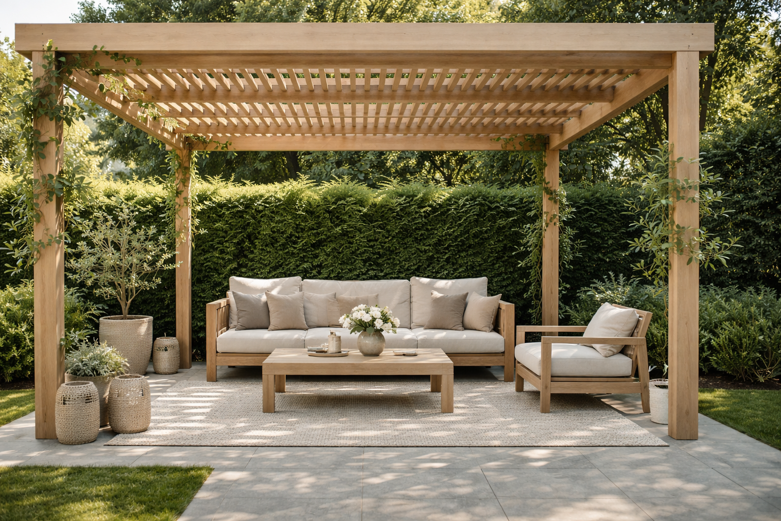 Houd het sober en samenhangend: een rustige basis, natuurlijke materialen en weinig visuele drukte. Kies een strakke indeling met één duidelijke pergola-plek en laat groen en textuur het werk doen. Sfeer zit in eenvoud, niet in veel losse decoratie.