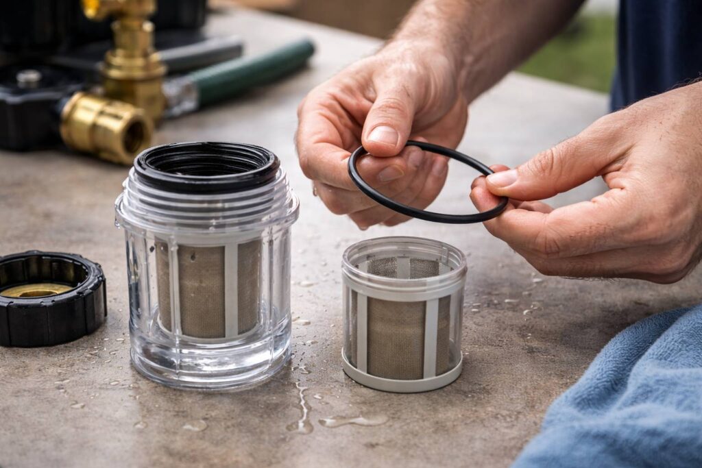 - Water rond het filterdeksel → vaak O-ring vuil of scheef, of filterhuis te strak/te los