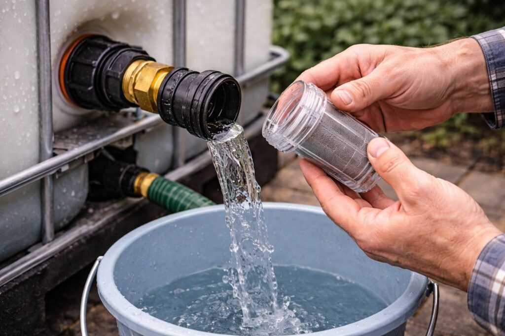 IBC-water kan veel vuil bevatten. Daarom werkt “grof → fijn” vaak het best.